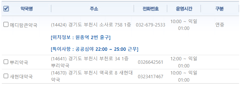 | 메디팜해성약국 | 경기도 부천시 원미동 90-8 | 032-613-5028 | 09:30 ~ 23:00 |