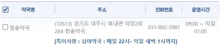 | 마트온누리약국 | 경기도 여주시 세종로 151 | 031-886-0816 | 10:00 ~ 22:00 |