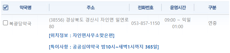 | 복광당약국 | 경북 경산시 자인면 일연로 80 | 053-857-1150 | 09:00 ~ 익일01:00 |