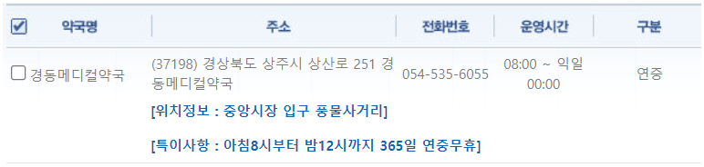 | 경동메디칼약국 | 경북 상주시 상산로 251 | 054-534-6055 | 08:00 ~ 익일00:00 |