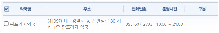 | 약국명 | 주소 | 전화번호 | 운영시간 |