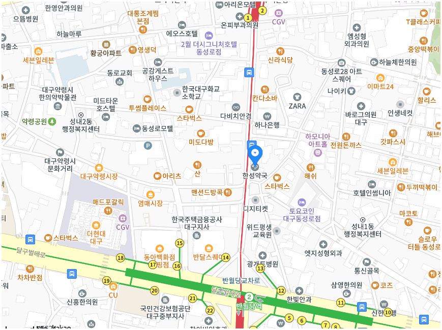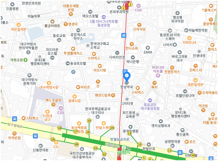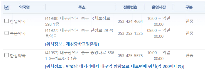 대구 중구에 위치한 약국 중 심야약국을 운영하는 곳은 한일약국, 복음약국, 한성약국 3군데 입니다.