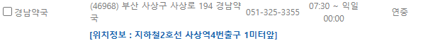 | 경남약국 | 부산 사상구 사상로 194 | 051-325-3355 | 07:30~익일00:00 | 연중무휴 |