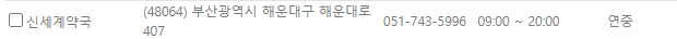 | 신세계약국 | 부산 해운대구 해운대로 407 | 051-743-5996 | 09:00~20:00 | 연중무휴 |