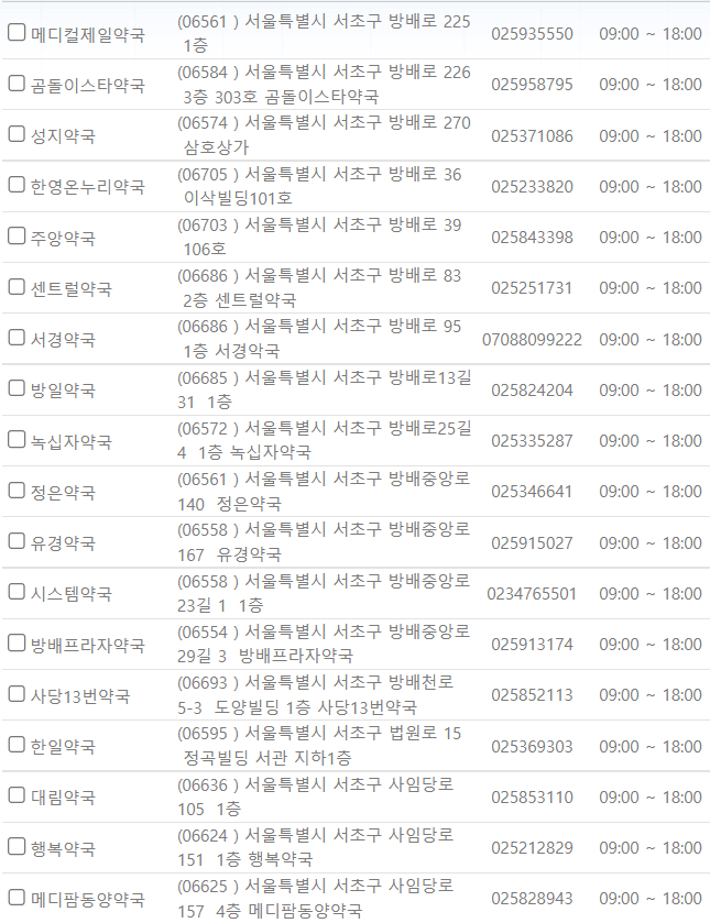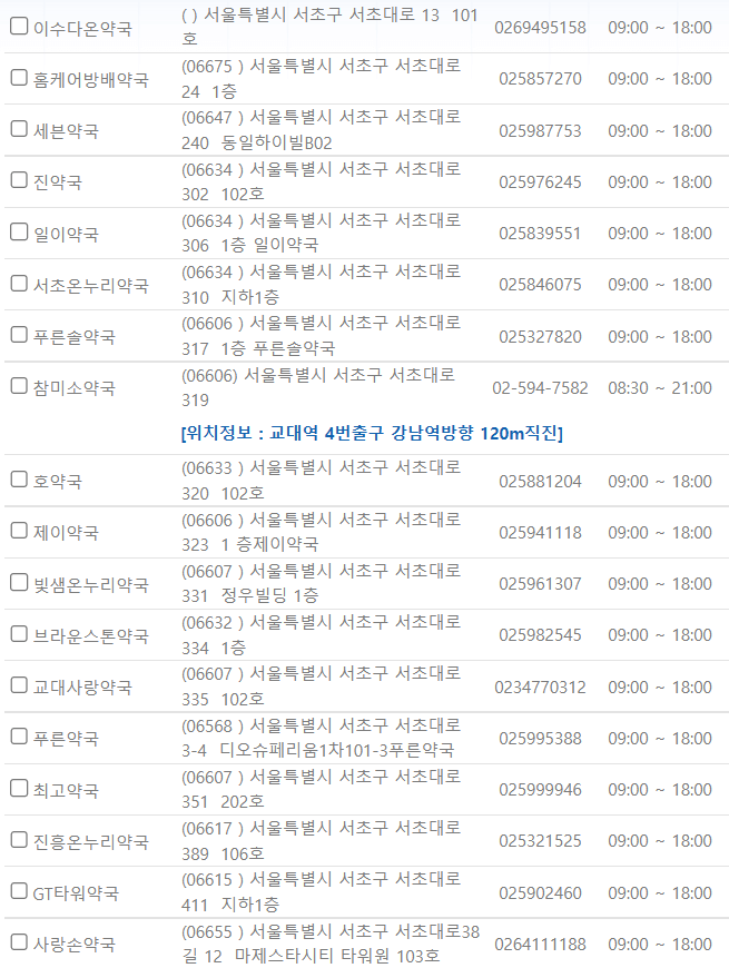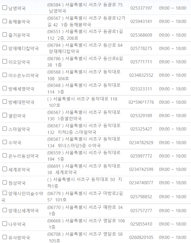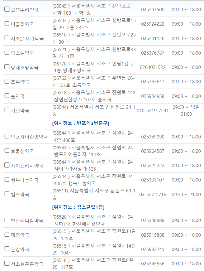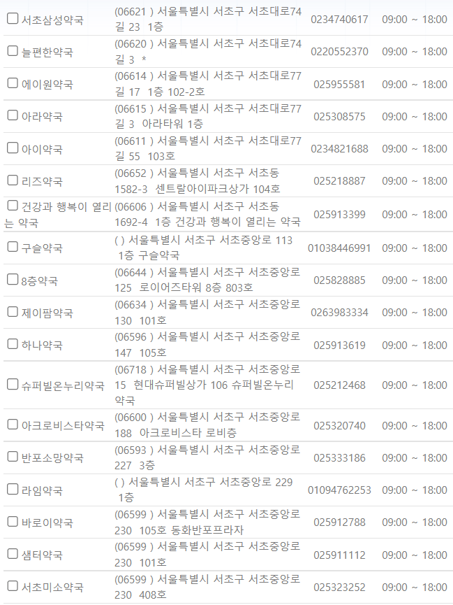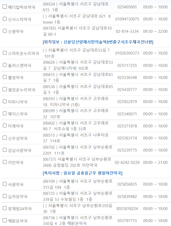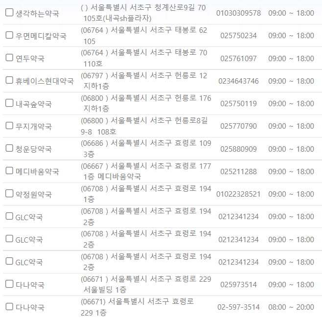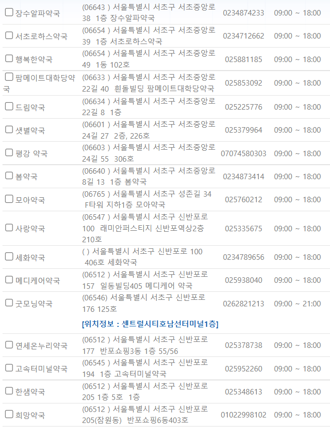제가 미리 서울 서초구 일요일에 영업하는 약국을 찾아보았습니다. ⬇️아래 사진을⬇️ 참고해 주시기 바랍니다.