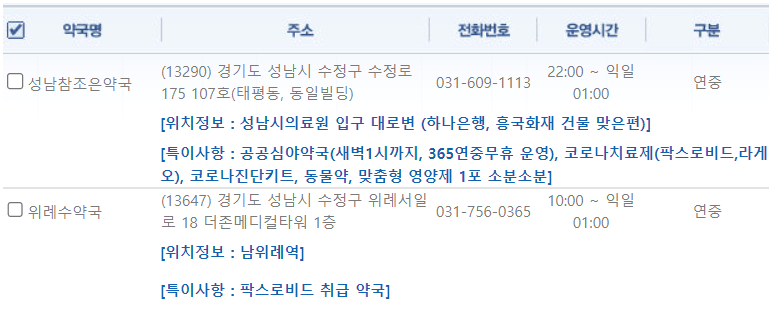 경기도 성남시 수정구에 위치한 약국 중 심야약국을 운영하는 곳은 성남참조은약국, 위례수약국 2군데 입니다.