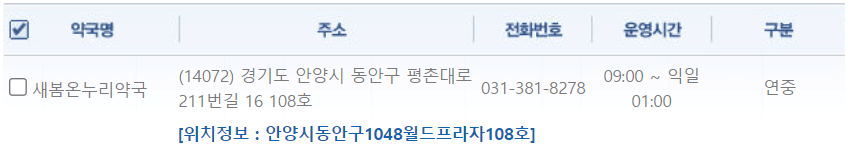 | 새봄온누리약국 | 경기도 안양시 동안구 평촌대로 211번길16 | 031-381-8278 | 09:00 ~ 익일01:00 |