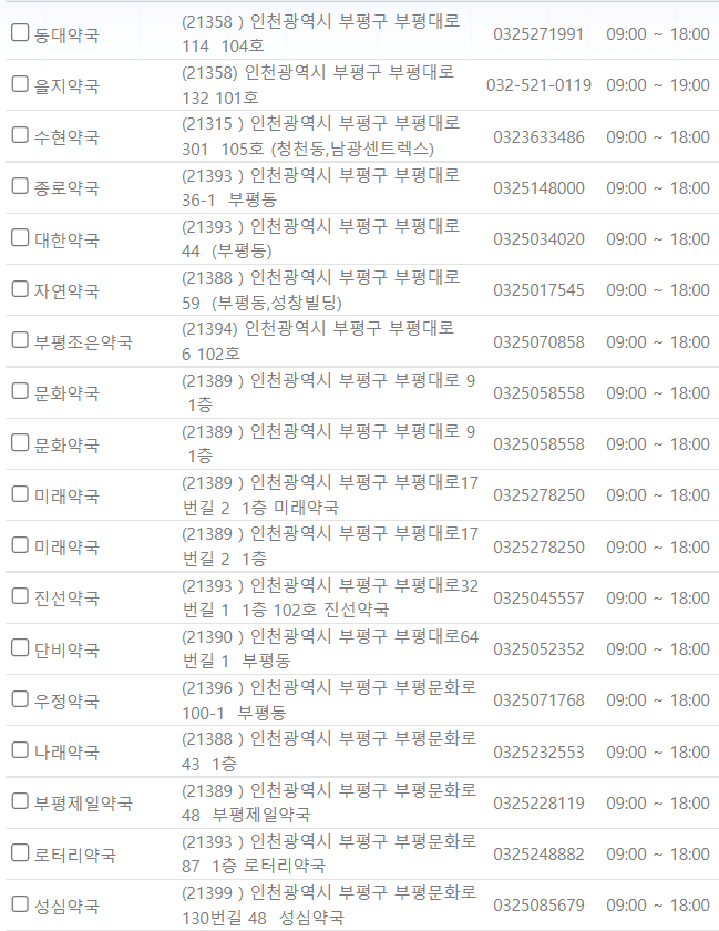 | 동광약국 | 인천광역시 부평구 부흥로 314-1 | 032-524-4990 | 12:00 ~ 익일 01:00 |