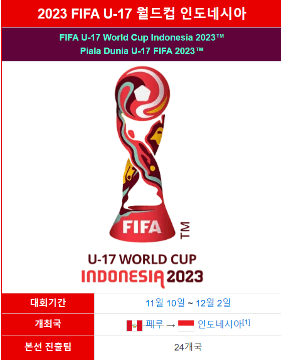 2023 U-17 월드컵은 11월 10일 개막해서 12월 2일까지 약 한 달 동안 인도네시아에서 열리는 축구 대회입니다.